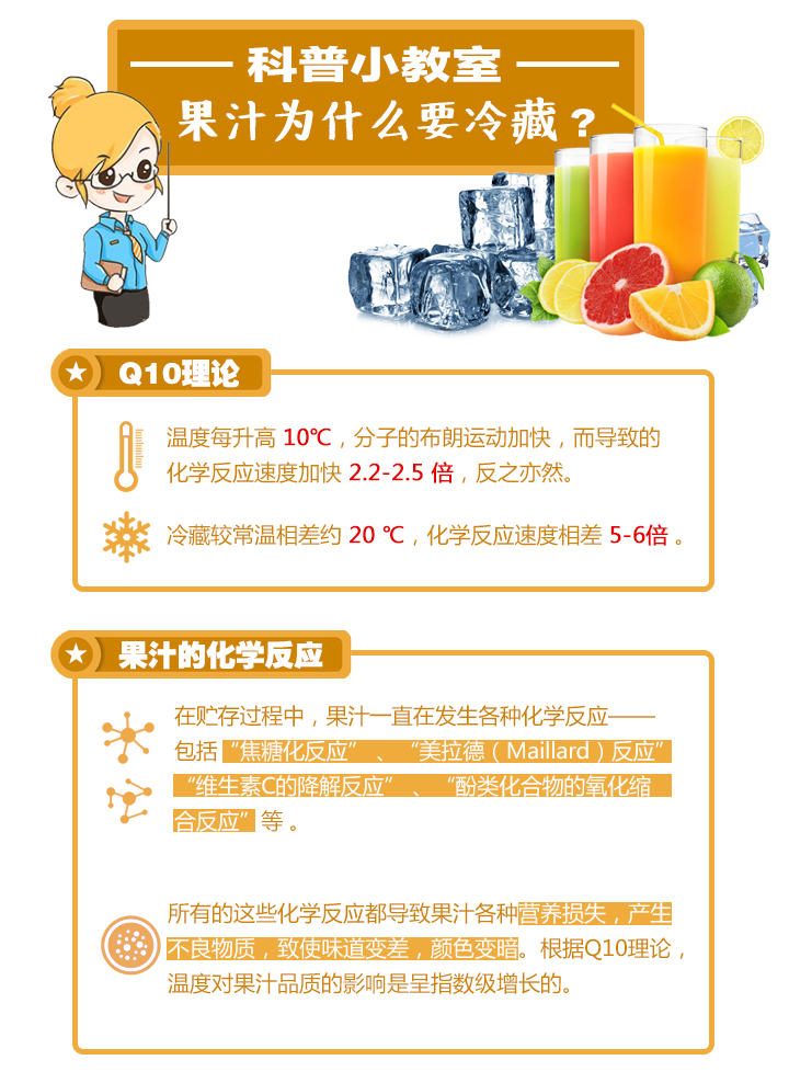 在超市中通常有常溫果汁和冷藏果汁兩種果汁飲料。常溫果汁保質(zhì)期都很長,生產(chǎn)過程中需要經(jīng)過高溫長時間的殺菌,這往往會對營養(yǎng)造成破壞;冷藏果汁保質(zhì)期較短,采取短時間的適度殺菌,通常能保留較多的營養(yǎng)成分。