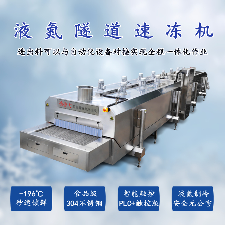 德捷力預制菜液氮速凍機低溫極限溫度低達-196°C,當預凍品接觸超低溫速凍設備后迅速氣化,就能瞬間帶走凍品表面熱量進行熱交換。以秒速的時間通過冰晶生長帶,在凍品組織中行成均勻分布的極小結晶。瞬間鎖住凍品水分,幾乎達到了無損失,從而保持了食品的原色、原味、原質和原形。