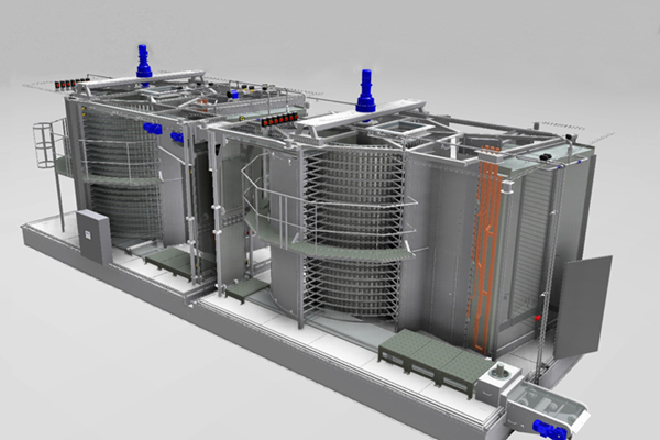 為適應(yīng)市場(chǎng)需求,我公司在單螺旋速凍裝置的基礎(chǔ)上又開(kāi)發(fā)出一種新型的雙螺旋速凍裝置,它采用了兩個(gè)轉(zhuǎn)塔的結(jié)構(gòu),除了具有單螺旋速凍機(jī)的特點(diǎn)外,還具有下列特點(diǎn):